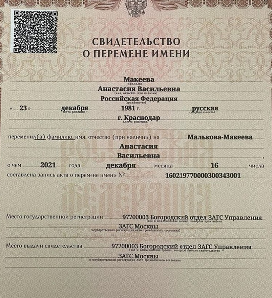 Из бумаги следует, что Анастасия все же не пошла до конца и не отказалась от своей девичьей фамилии. В документе она записана как Малькова-Макеева.