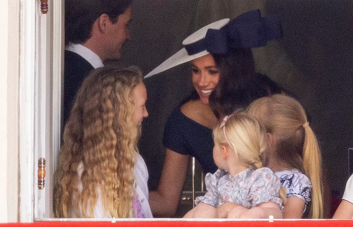 На снимках видно, как герцогиня Сассекская сначала мило болтает с Саванной Филлипс и Мией Тиндалл — правнучками Елизаветы II, а после отходит к принцу Гарри и герцогу Кентскому.