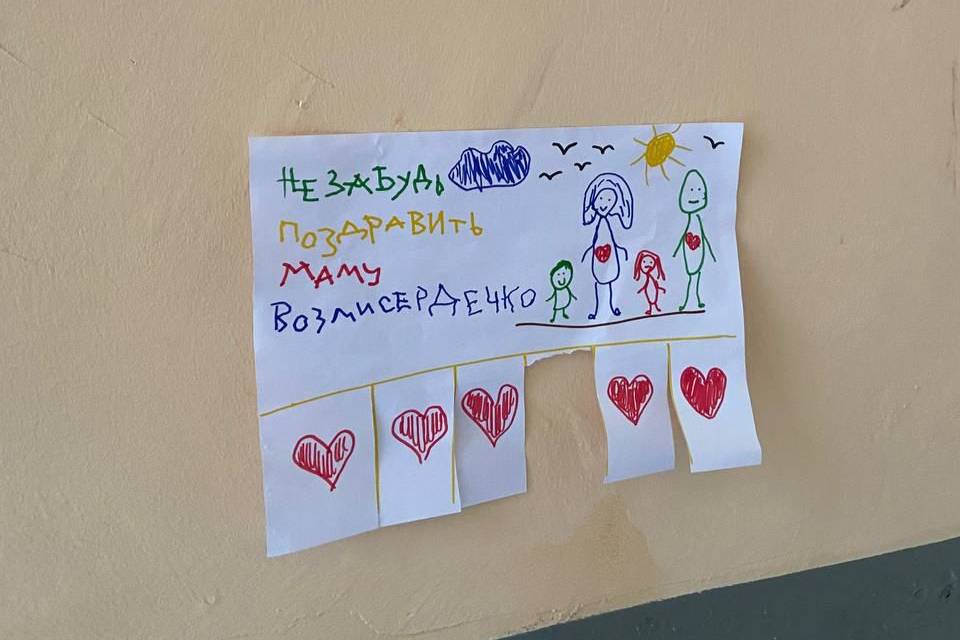 Желающие могут оторвать бумажное сердечко и вручить его своей матери.
