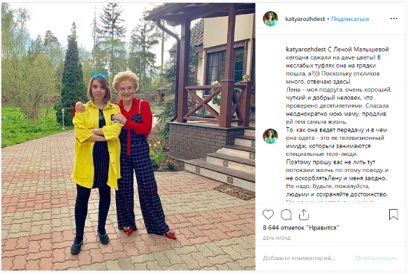 В комментариях к снимку Рождественская встала на защиту Малышевой. Отметив, что Елена даже на даче не может расслабиться и выйти из образа, который ей навязали некие "теле-люди".