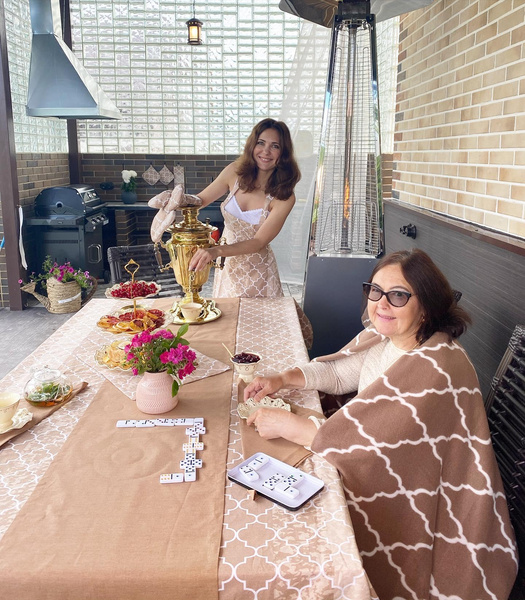 Эти идеи продолжаются и в уличной обеденной зоне. «Скатерки и самовары расположились рядом с современным грилем и промышленной вытяжкой. Не устаю повторять, что интерьер получился просто чудный!», — резюмирует специалист.