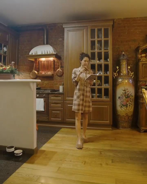 В кухонно-гостиной зоне мы видим рельефную полку на кладке, которая является типичной для классической русской печи. Нам привычнее видеть там котелки и ковши, а вот артистка решила иначе и расставила в печке книги.