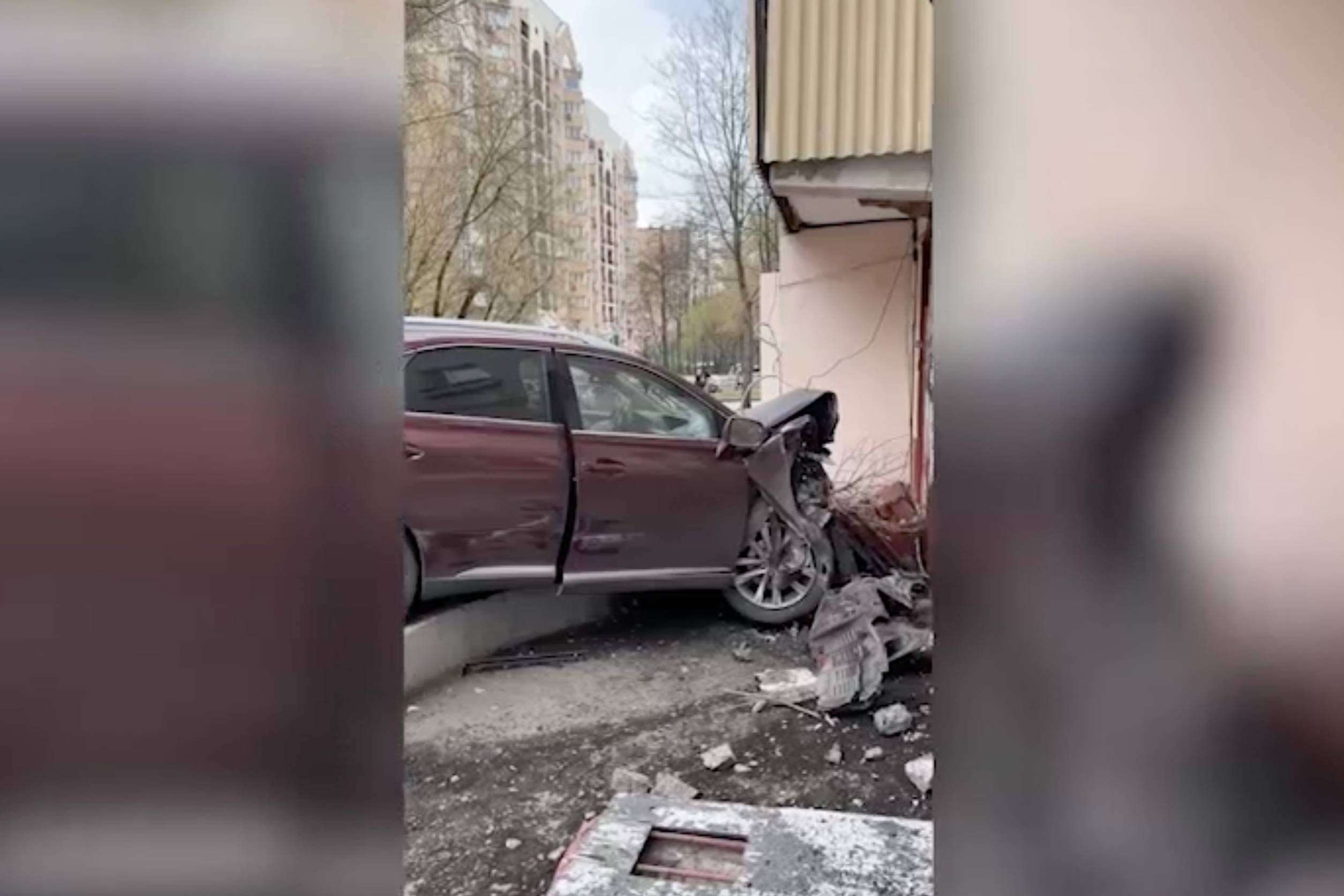 На опубликованных кадрах видно, что машина буквально «впечаталась» в подъезд, пробив стену. Бампер автомобиля оказался «зажёван» от удара. Обстоятельства происшествия выясняются.