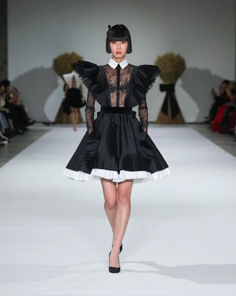 Начался показ с черного и белого — строгих, почти графичных образов, которые отсылают к годам, проведенным будущей легендой в монастырском приюте. Это время формирования характера, сдержанности и дисциплины