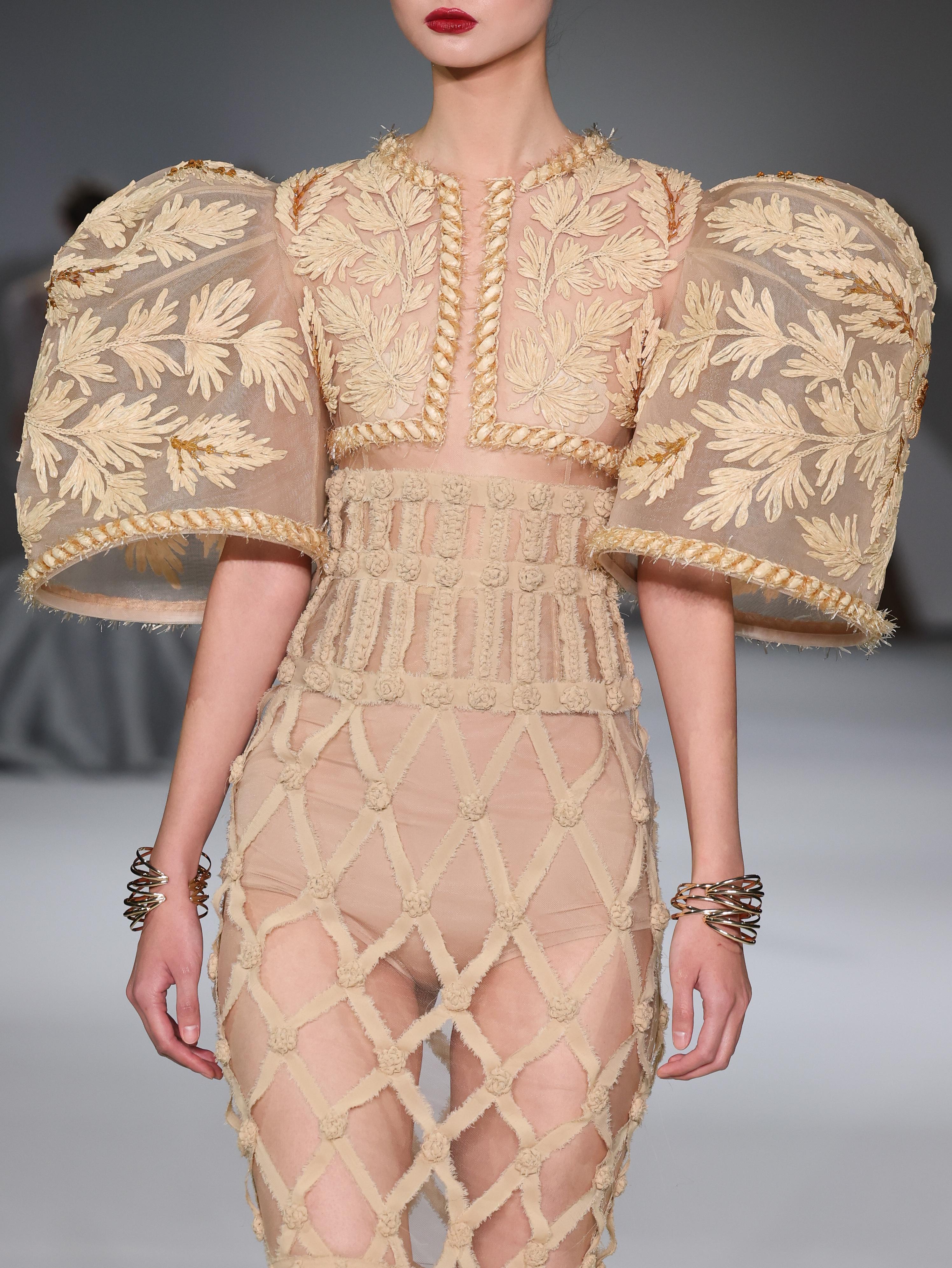Ручная работа всегда была визитной карточкой YANINA Couture, и в этой коллекции она достигла невероятных высот. Дизайнеры освоили новые для себя материалы, например натуральную рафию. В ход пошли сложнейшие техники: вышивка соломкой и вприкреп, ручное плетение, ажурное ришелье. На платьях расцвели нежные розы из шифоновых лент, пышные камелии, а также появились элементы, отсылающие к русскому наследию, — владимирские швы и золотное шитье. Вся эта красота создает удивительный контраст матовых и глянцевых фактур и игры со светом.