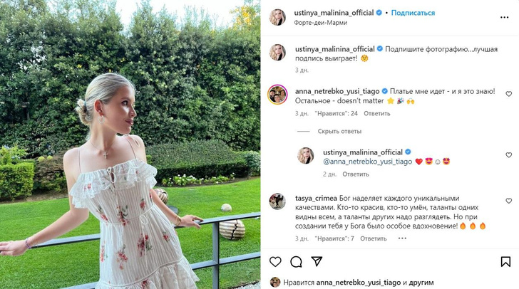 Устинья решила устроить конкурс среди подписчиков — она попросила придумать подпись к фото. Побороться за звание победителя решила Анна Нетребко.