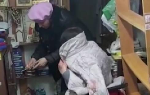 На видео показано состояние лавки после ограбления. Там перевёрнутые вещи, разбитые витрины, упавшие на пол иконы и прочие атрибуты православной церкви. На одной из стен следы крови. В углу помещения на стуле сидит женщина и держится за вздувшееся, окровавленное лицо.