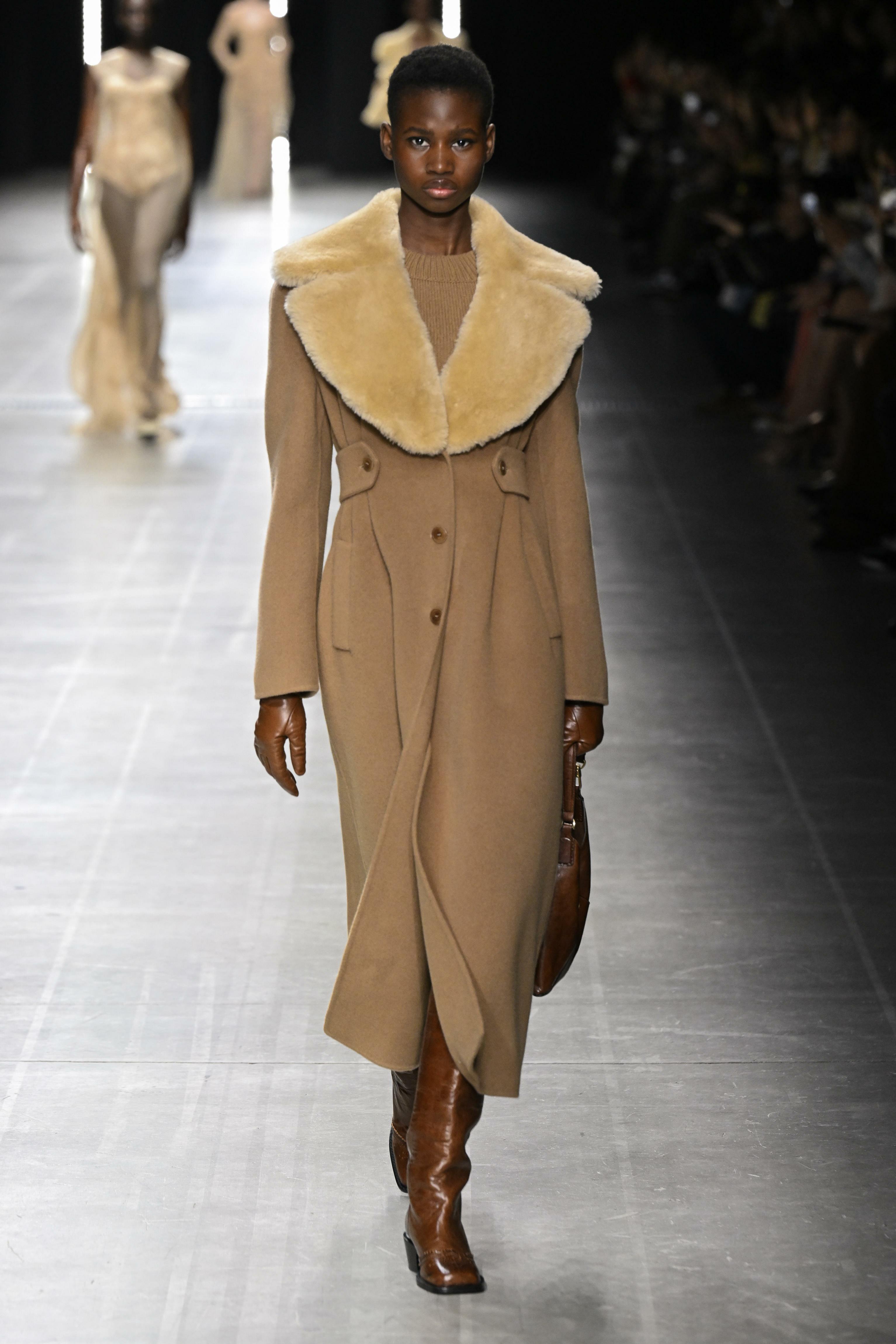 Мех — отдельная история этого сезона. В осенне-зимних коллекциях 2025/2026 года он появился буквально повсюду: на шапках, сумках и, конечно же, на верхней одежде. Но если раньше это в основном были шубы, бомберы и дубленки, теперь преобладали классические (но роскошные) пальто с пушистыми, густыми меховыми воротниками. И все благодаря тренду на эстетику mob wife, возрождению моды 1970-х и усталости от минимализма в стиле «тихой роскоши».
