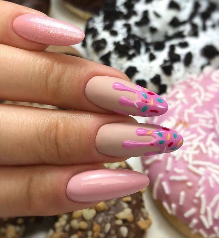 Но вот любительницам ярких дизайнов такой жемчужный эффект быстро наскучил. Они решили совместить задумку Хейли и свои идеи и создали маникюр, напоминающий глазурь пончика или подтаявшее мороженное.