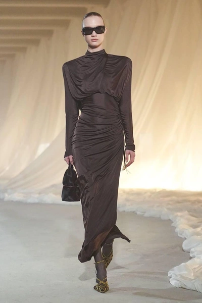 Также накануне Даниленко блистала на подиуме Balmain в дебютном шоу Антонена Трона, который сменил Оливье Рустена на посту креативного директора. Даша показала сразу два образа: изумрудное и коричневое платья. Оба с акцентными плечами, красивыми драпировками и при этом настолько самодостаточные, что не требуют никаких дополнений.