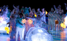 Первыми на арену вышли дети в костюмах снежинок. Снежинки выбраны неспроста — в мире нет ни одной повторяющейся и организаторы решили таким образом подчеркнуть, что каждый участник Игр уникален и удивителен.