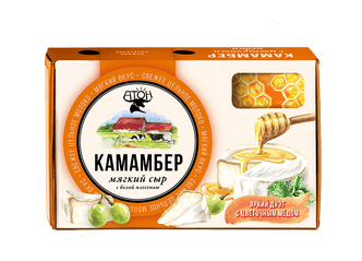 Камамбер «АТОН» — мягкий сыр с белой плесенью из свежего цельного молока. Без заменителей молочных жиров. В наборе с мёдом или джемом.