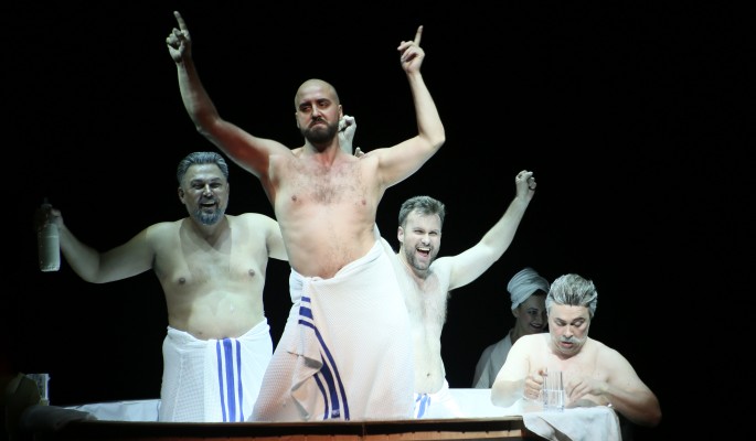 Шемаханская царица в этом спектакле – звезда ночного стрип-клуба, вокруг которой вьются атлетические красавцы в золотых облегающих шортах. В этом же клубе царь Додон найдет своих сыновей, которых отправил за ратными подвигами, но те не доехали.