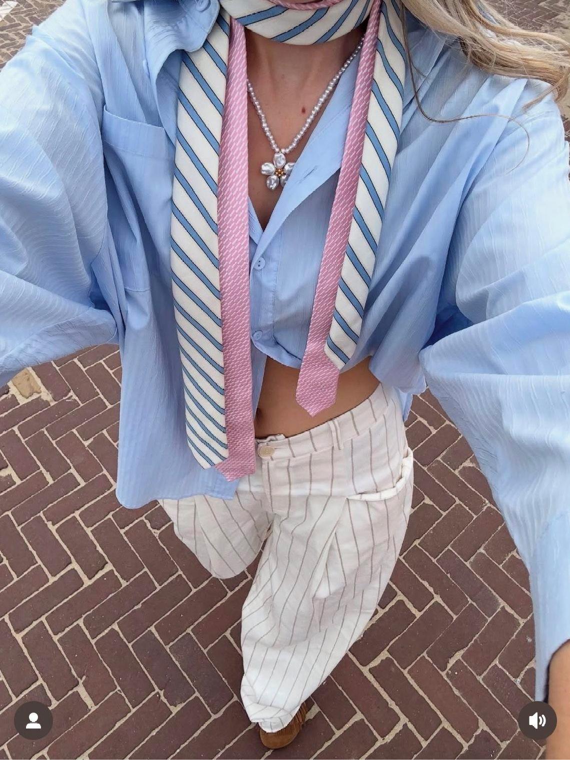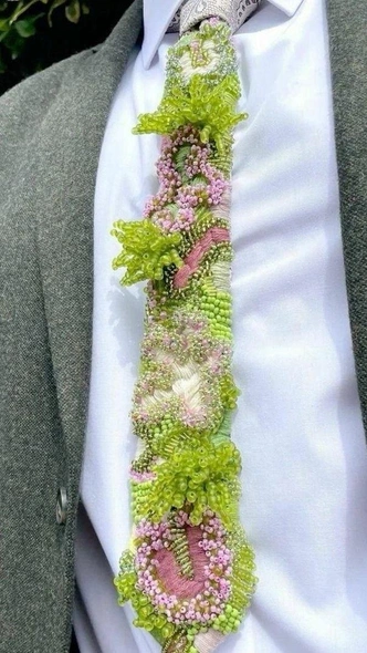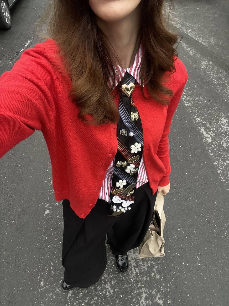 Хотя модницы в этом сезоне уверены: главное — не с чем носить этот аксессуар, а как он выглядит. Поскольку сейчас в тренде именно кастомные галстуки. Их украшают бусинами, брошками, нашивками и разными значками. И это отличная идея, как вдохнуть вторую жизнь в старую вещь и сделать образ чуточку креативнее. Можно взять классический галстук из гардероба мужа или купить недорогой вариант в масс-маркете/на маркетплейсе и превратить его в уникальный аксессуар своими руками. Тем более что сейчас в моде нестандартные решения и хендмейд.