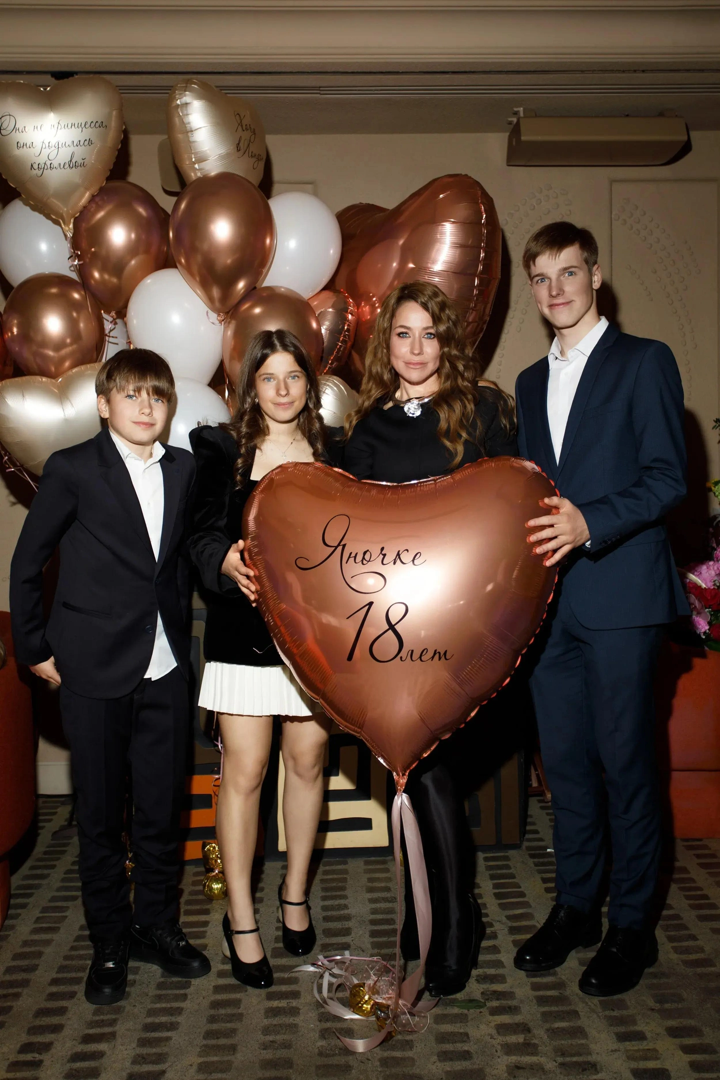 Празднование проходило в одном из московских ресторанов. Зал был украшен воздушными шарами медного оттенка и цветочными композициями. Сама именинница выбрала для вечера элегантное черное бархатное платье с плиссированной юбкой, а ее братья Артем и Арсений поддержали строгий дресс-код, появившись в классических костюмах
