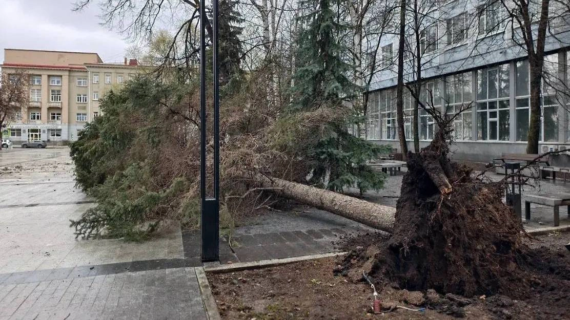 За первую половину дня в ЕДДС поступило семь обращений о падении деревьев на линии электропередачи и машины. Одна из елей упала прямо на территории педагогического университета. Ещё одно дерево повалило на улице Гафури. В микрорайоне Сипайлово потоками ветра оторвало крупный фрагмент наружной облицовки жилой высотки, повредив несколько припаркованных во дворе машин.