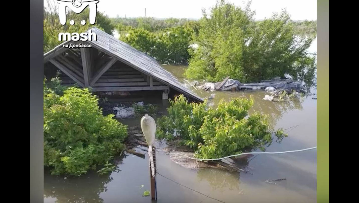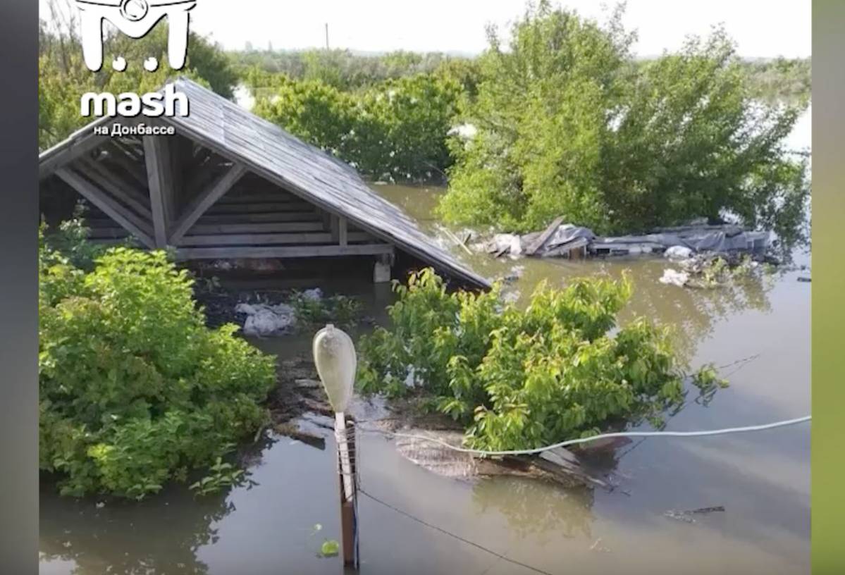 Лишь крыши домов и верхушки деревьев видно в затопленном селе Корсунка Херсонской области. Оно полностью ушло под воду после разрушений на Каховской гидроэлектростанции.