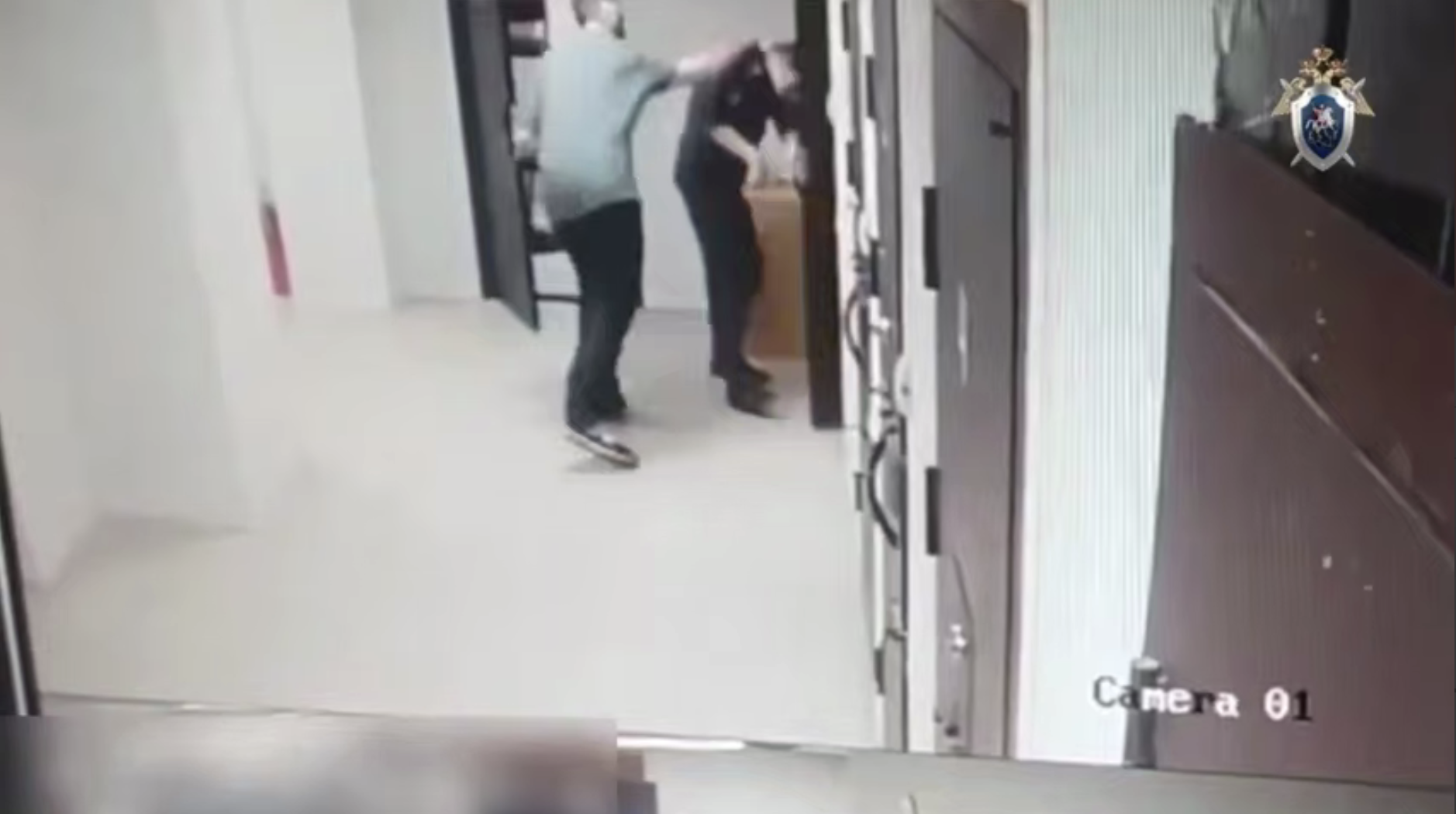 На записи видно, что задержанного вывели в коридор, где один из правоохранителей начал открывать дверь. В этот момент преступник, державший в руках какой-то белый свёрток, ударил полицейского по голове каким-то предметом. Сотрудник от неожиданности упал на пол, а нападавший бросился с кулаками на его напарника, который находился в соседней комнате и не успел среагировать.