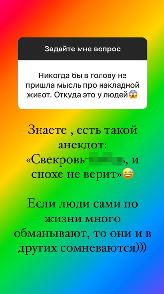 Отвечая на это сообщения, Орлова не сдерживалась в нецензурных выражениях: «Знаете, есть такой анекдот: „Свекровь-бл***, и снохе не верит“. Если люди сами по жизни много обманывают, то они и в других сомневаются».