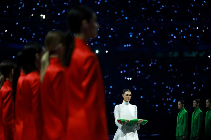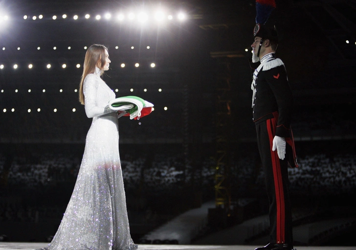 Флаг Италии на стадион «Сан-Сиро» в Милане торжественно вынесла топ-модель и возлюбленная Леонардо ДиКаприо Виттория Черетти. Модель была одета в длинное белое платье от Armani Privé, сшитое на заказ, с эффектными длинными рукавами и высоким воротником. Это особая привилегия, которой 20 лет назад удостоилась итало-французская певица и модель Карла Бруни во время зимних Олимпийских игр 2006 года в Турине.