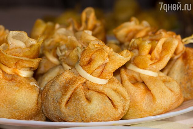 - Собираем панкейк-сюрприз: заполнить каждый блин яблоками и завязать его в виде мешочка (например, сыром-косичка).