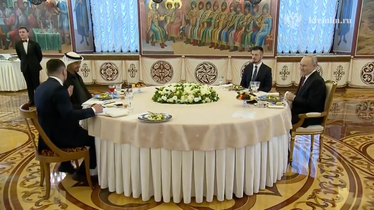 Российско-эмиратские переговоры продолжились в формате официального завтрака. На видео — то, как Владимир Путин и Мухаммед бен Заид Аль Нахайян с переводчиками садятся за стол. Можно заметить, что они пребывают в хорошем настроении.
