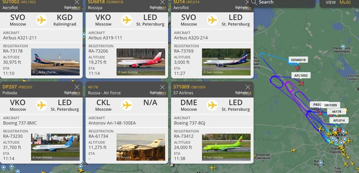 По данным сервиса Flightradar, самолеты облетают Пулково или нарезают круги где-то рядом, если им нужно приземлиться в Питере.