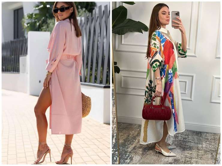 Если вы хотите придать луку более шикарного настроения или использовать платье-халат на выход, то выбирайте изящные босоножки на каблуке с тонкими ремешками и переплетениями, либо туфли или слингбэки», — советует эксперт.