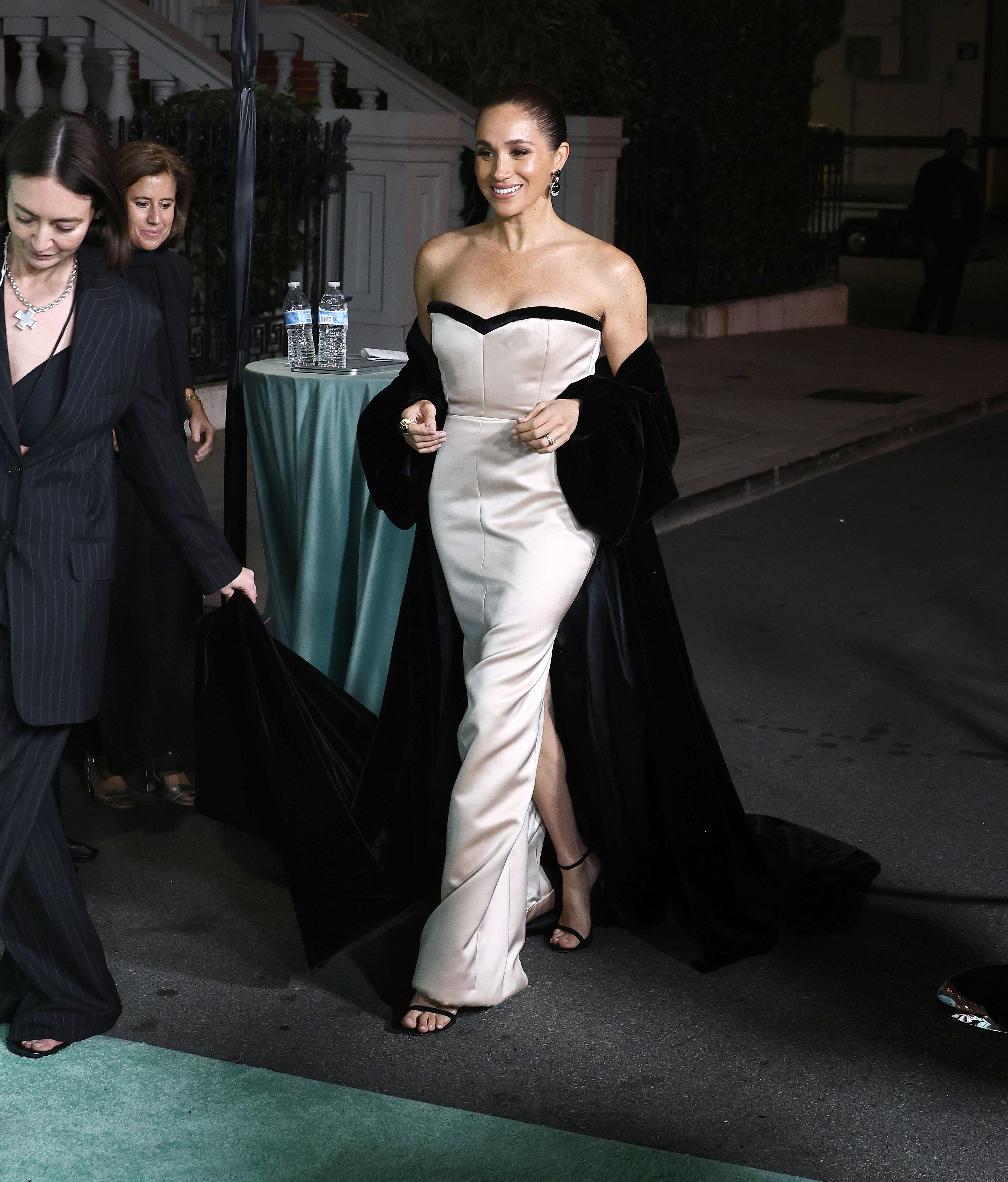 Для своего сольного выхода Меган остановилась на вечернем платье без бретелей жемчужного оттенка, созданном на заказ дизайнером Чарльзом Харбисоном из Harbison Studio. Лаконичный крой, мягко подчеркивающий фигуру, и черная окантовка по линии декольте в форме сердца отсылали к классическим силуэтам 40–50-х годов — тем самым, которые ассоциируются с Грейс Келли и Ритой Хейворт. Платье выглядело сдержанно, но при этом безошибочно роскошно.