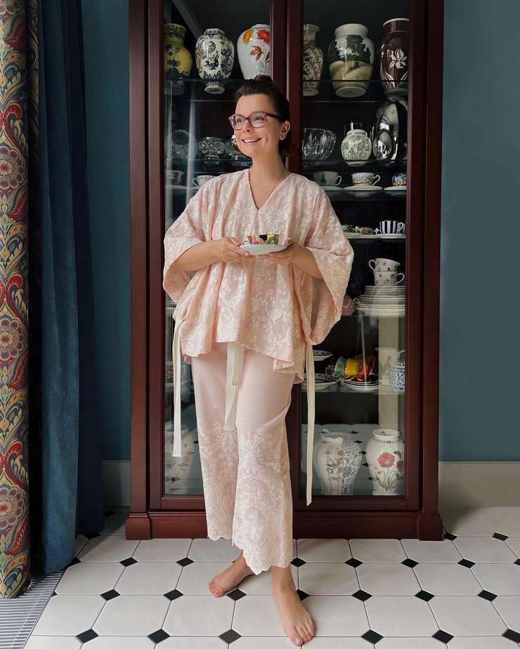 Как выяснилось, домашние дела Татьяна предпочитает выполнять в элегантном костюме пудрового оттенка.