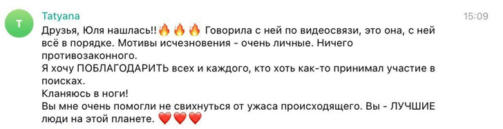 «Мы нашли Юлю! Она в порядке и в безопасности. Мама уже пообщалась с дочкой по видеосвязи и благодарит всех, кто помогал. Мы понимаем, что всем очень любопытно, где она и что произошло