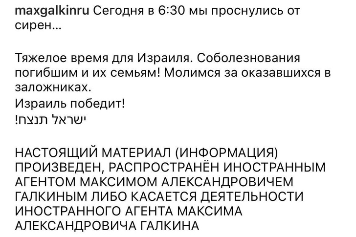 «Сегодня в 6:30 мы проснулись от сирен…» — с этих слов начался пост Максима Галкина*, опубликованный в его в социальных сетях 7 октября. В этот день Израиль подвергнулся ракетным ударам со стороны сектора Газа. Это стало крупнейшей за последние годы эскалацией израильско-палестинского конфликта. «Граждане Израиля, мы находимся в состоянии войны», — подчеркнул премьер-министр страны Биньямин Нетаньяху.