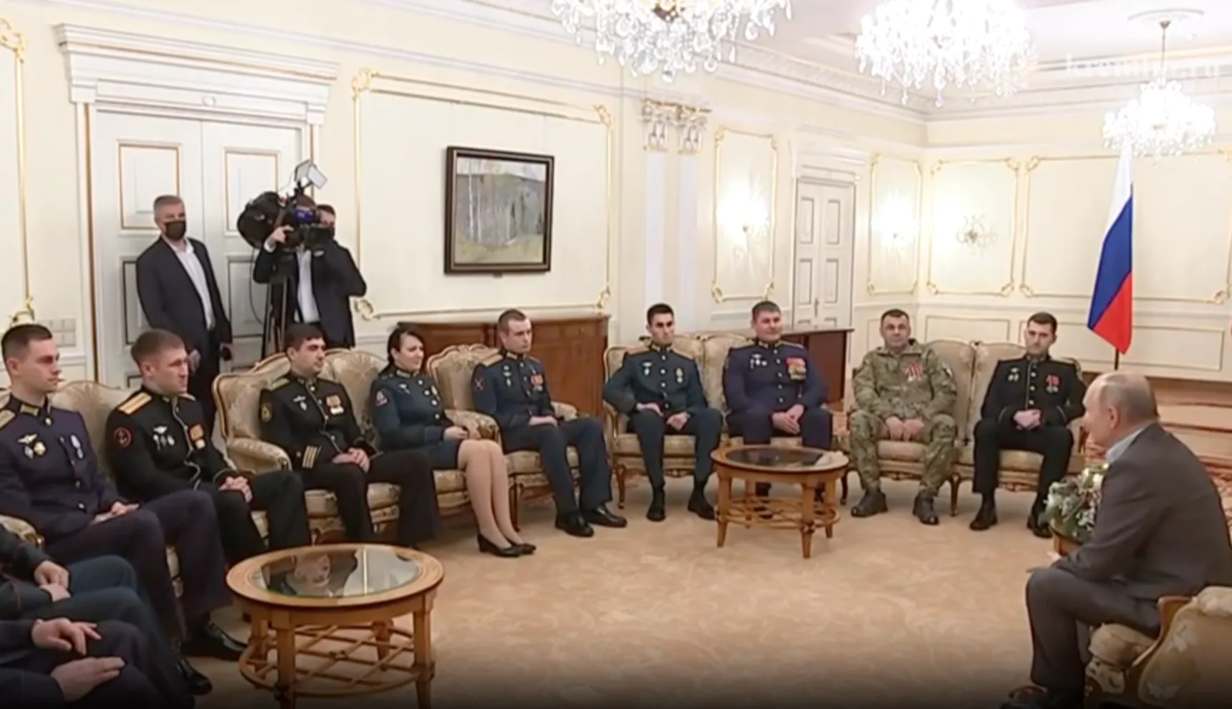 Президент РФ Владимир Путин встретился с участниками спецоперации в неформальном формате в Ново-Огарёве после сегодняшнего визита к раненым бойцам в госпиталь им. А.А. Вишневского. Видео телеграм-канал Кремля.