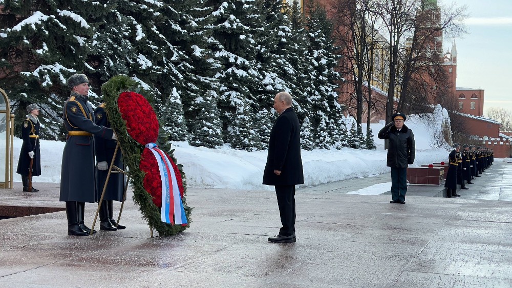 Под звуки военного оркестра к Вечному огню был доставлен венок из алых роз и хвои. Российский лидер, преклонив колено, поправил ленты в цветах национального триколора, на которых золотом было выведено обращение к Неизвестному солдату от президента.