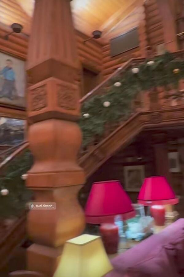 В зале стоит высокая елка с советскими игрушками, гирляндами и фигурой Деда Мороза. Высоцкая отметила, что наряжала елку вместе с любимым супругом. Ведущая украсила и лестницу на второй этаж. Она повесила на перила длинную гирлянду из еловых веток и шаров.