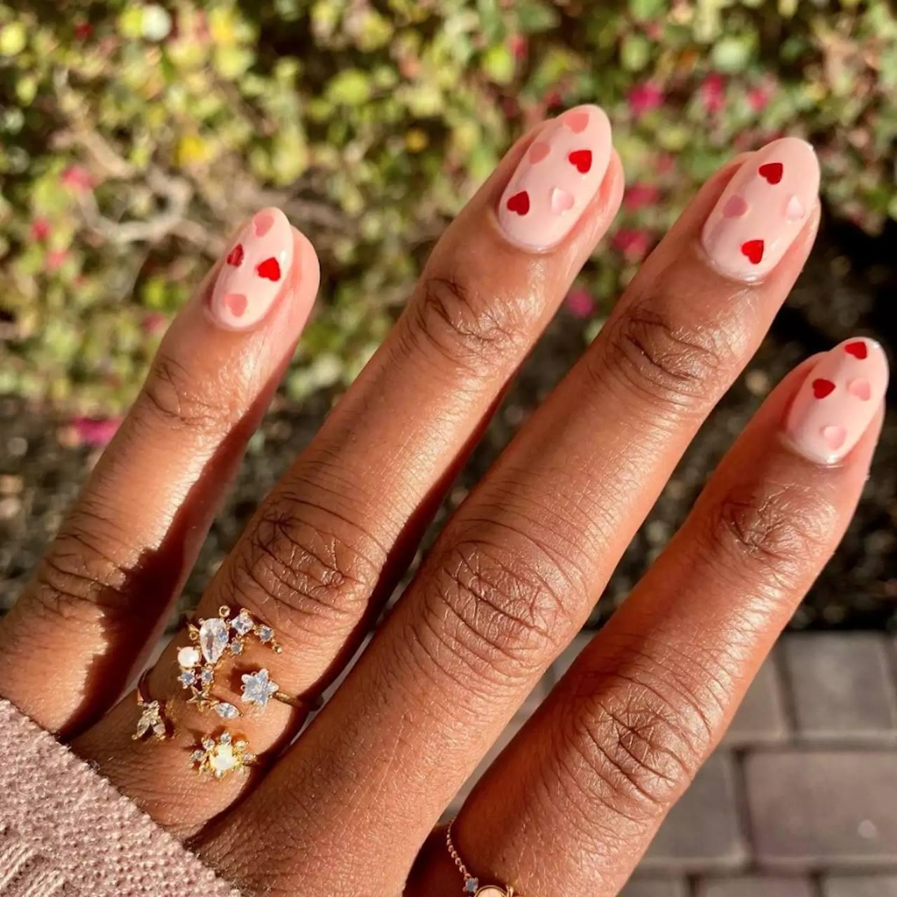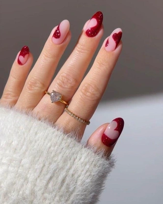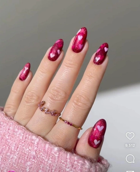 Хочется чего-то воздушного и игривого? Обратите внимание на этот дизайн. Его суть в эффекте прозрачности. За основу берется прозрачный, молочный или нежно-розовый нюдовый лак. А сверху, пока покрытие не высохло, укладываются мелкие блестки в форме сердечек. Они бывают разных оттенков: классические красные, нежные розовые, серебристые. Все это сверху закрепляется глянцевым, плотным топом, напоминающим эпоксидную смолу. Сердечки как будто застывают внутри, создавая впечатление желейной конфетки. Смотрится такой маникюр очень мило и минималистично.