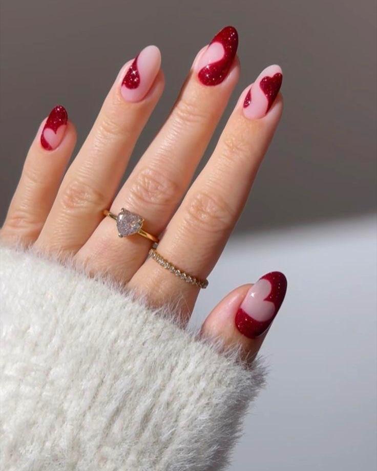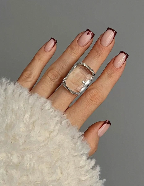 Иногда для праздника достаточно одного, но точно попавшего в цель акцента. Этот дизайн как раз такой. Прозрачное сердечко на безымянном пальце выглядит стильно и намекает на праздник, но не кричит о нем. Исполнить его можно по-разному. Например, сделать матовую нюдовую базу и на одном пальце нарисовать контур сердца и заполнить его прозрачным или слегка тонированным гелем. Или на глянцевом покрытии прорисовать контур сердца тонкой красной или розовой линией. Цвет, кстати, может быть любым, не обязательно классическим алым. Подойдет и глубокий винный, и лиловый, и даже черный для тех, кто не любит слишком «приторные» образы.