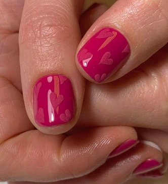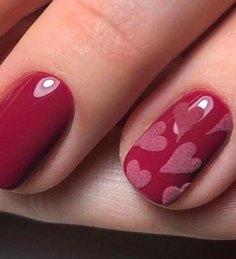 Хочется тактильных ощущений и объема? Тогда этот вариант для вас. Сначала ногти покрываются вашим любимым цветом как при обычном однотонном покрытии. Пусть это будет глубокий красный, нежный розовый или даже нейтральный бежевый. Затем цвет фиксируется топом. А дальше начинается творчество. На еще липкий слой прозрачного геля или топа с помощью тонкой кисти рисуются маленькие сердечки. Пока гель не застыл, их тут же посыпают специальной бархатной пудрой или специальным песком. Лишнее стряхивается, и получаются объемные, чуть шершавые на ощупь узоры. Они действительно напоминают бархатную вышивку. Такой маникюр получается очень уютным и необычным.