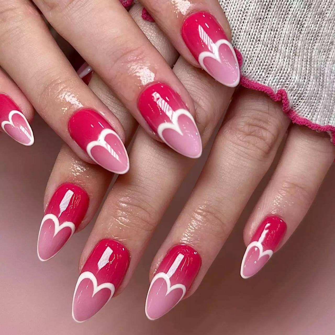 Градиентный переход от темного оттенка к светлому сам по себе выглядит очень нежно. Для 14 февраля идеально подойдет комбинация фуксии и нежно-розового. Сделайте плавный переход от яркой основы к светлому кончику. А затем добавьте деталь, которая превратит просто красивое омбре в праздничное. У линии, где заканчивается яркий цвет и начинается светлый, начните по контуру рисовать белое сердце до самого края ногтевой пластины. Оно станет тем самым акцентом, который сразу задаст нужное настроение.