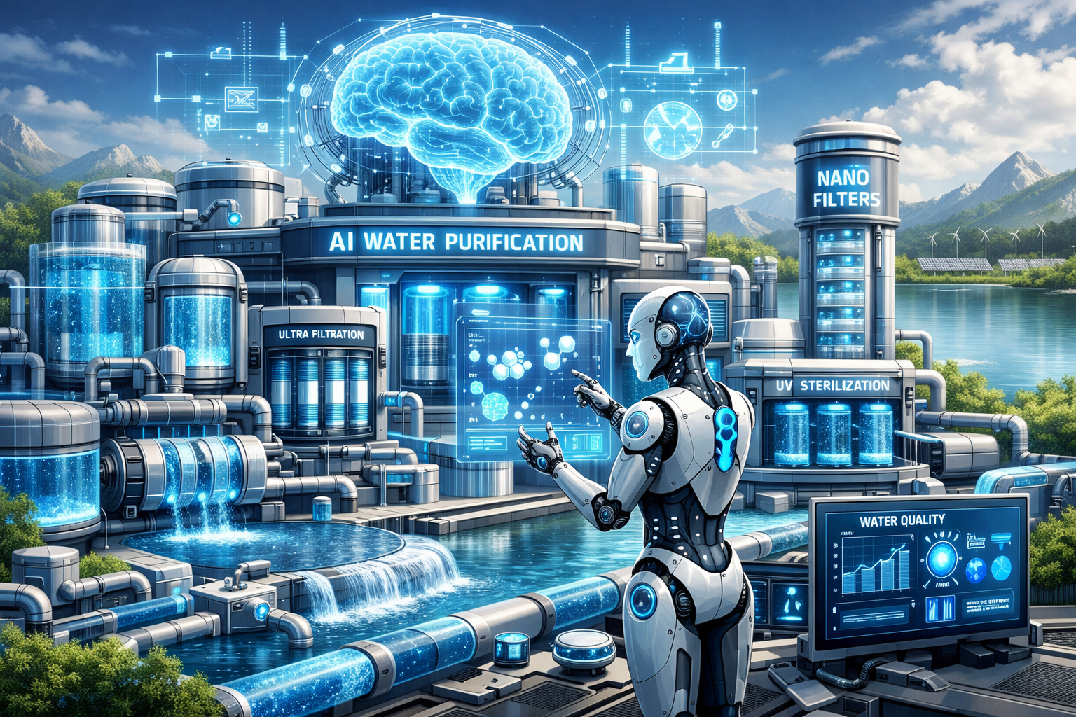 Второй этап — автоматическое управление в реальном времени. Сеть датчиков отслеживает параметры воды (кислотность, мутность, расход), а ИИ анализирует данные и регулирует работу насосов и дозировочных систем