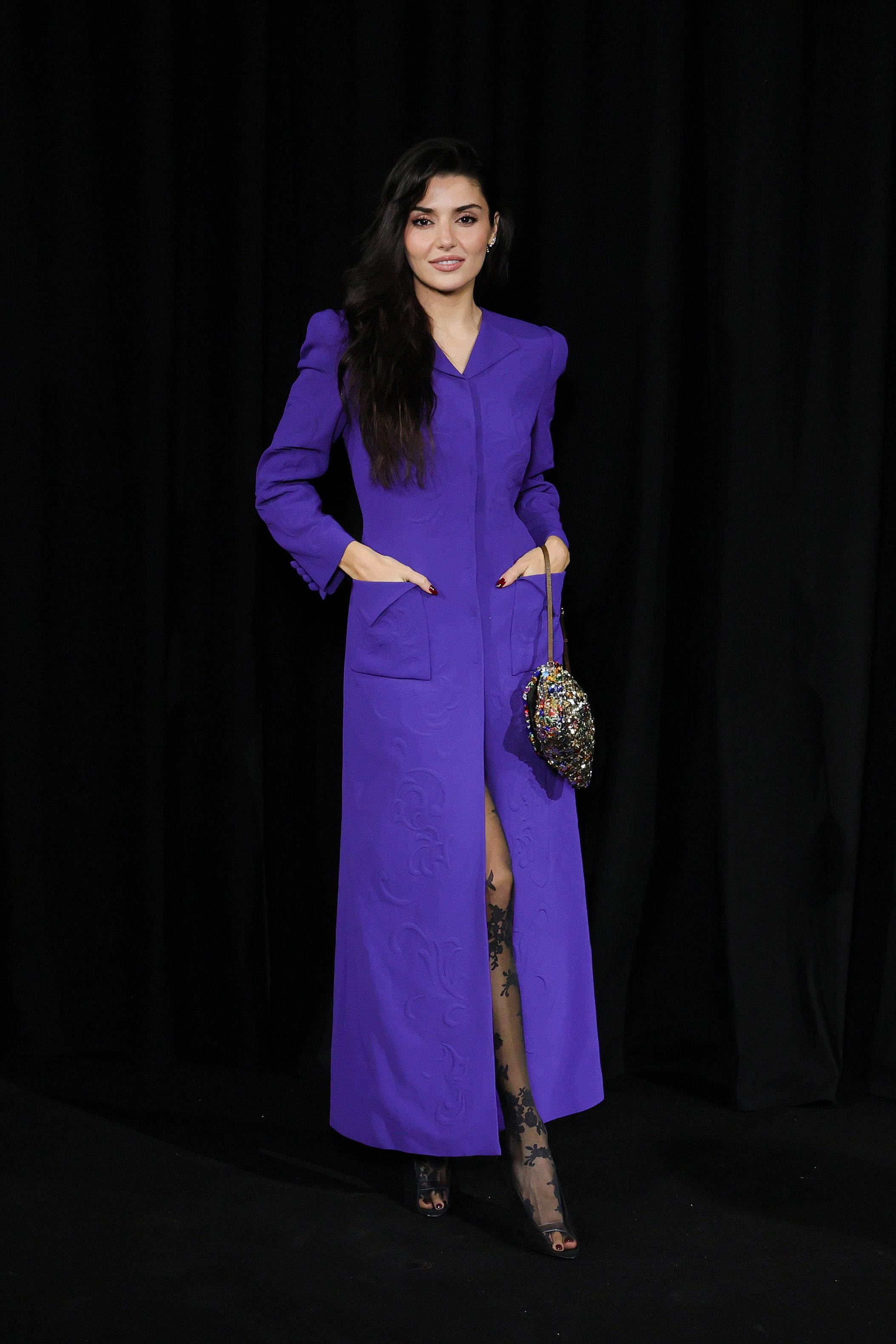 Звездных гостей в таких необычных первых рядах на этот раз было много. Например, красавица Тайла, Ханде Эрчел в длинном фиолетовом платье-жакете, Дакота Джонсон в ажурных колготках, эффектном боди и сияющем бомбере с перьями на рукавах, Кирстен Данст в голубом мини с драпировками и бантами, Элтон Джон в символичном алом смокинге, российская модель Алла Брулетова и давняя клиентка Дома Снежана Георгиева вместе с дочкой Софьей.