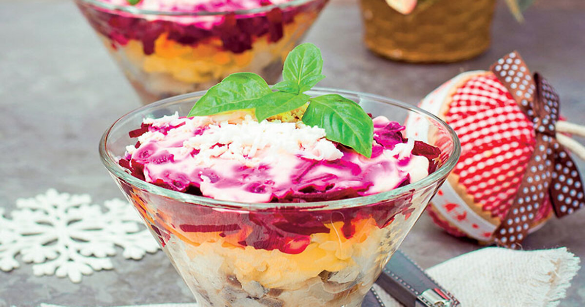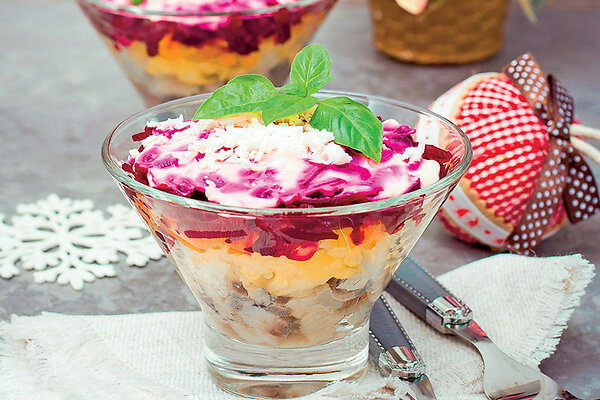В креманки выложить слоями рыбу, измельченный лук, немного майонеза, морковь, яблоки, немного майонеза, яйца, свеклу и оставшийся майонез.