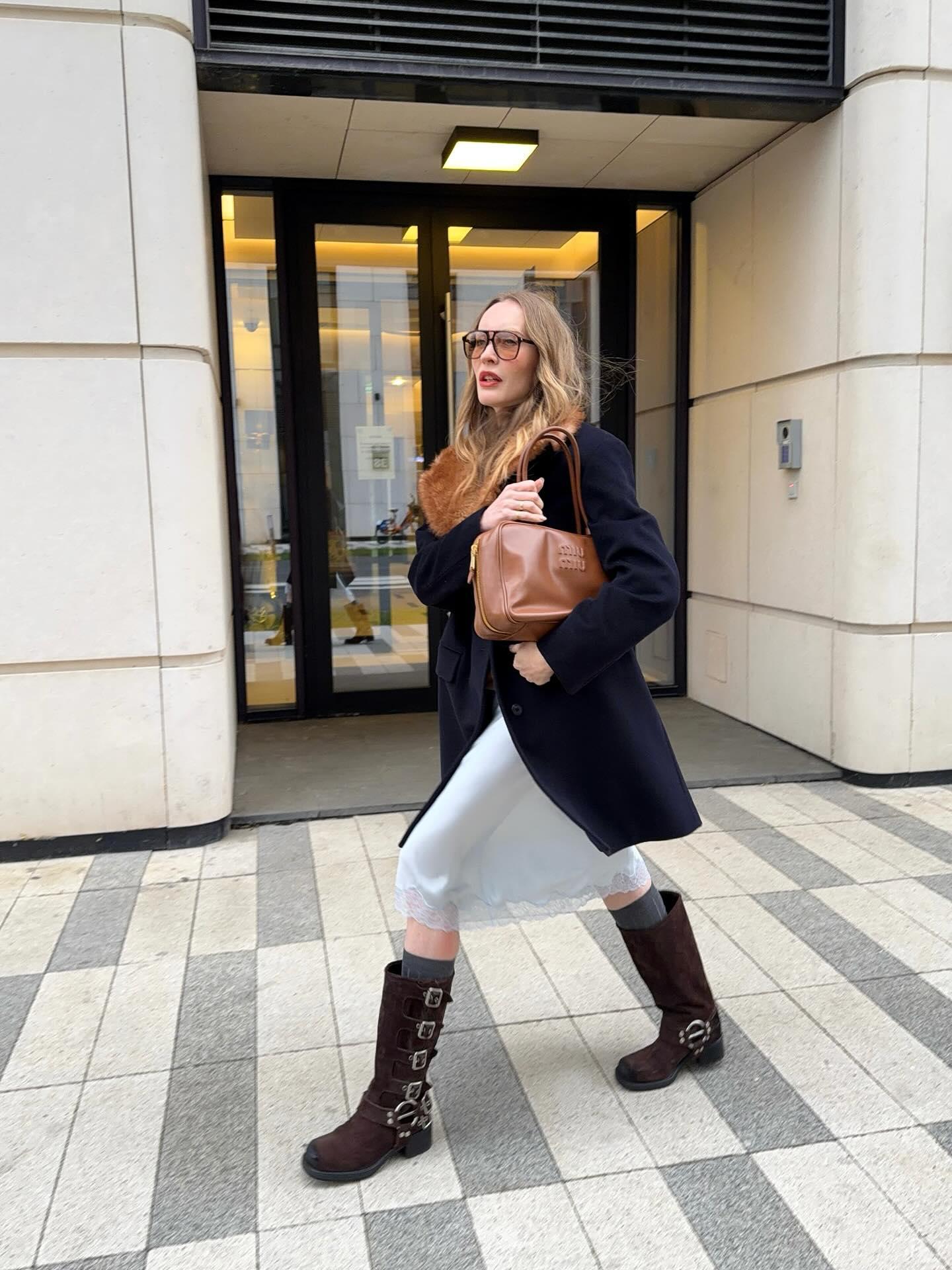 Впрочем, более теплые образы у нее тоже были. Блогерша уже успела выгулять и леопардовое пальто с косынкой и кожаными голубыми ботильонами, и трендовую модель с меховым воротником в сочетании с грубыми байкерскими сапогами.