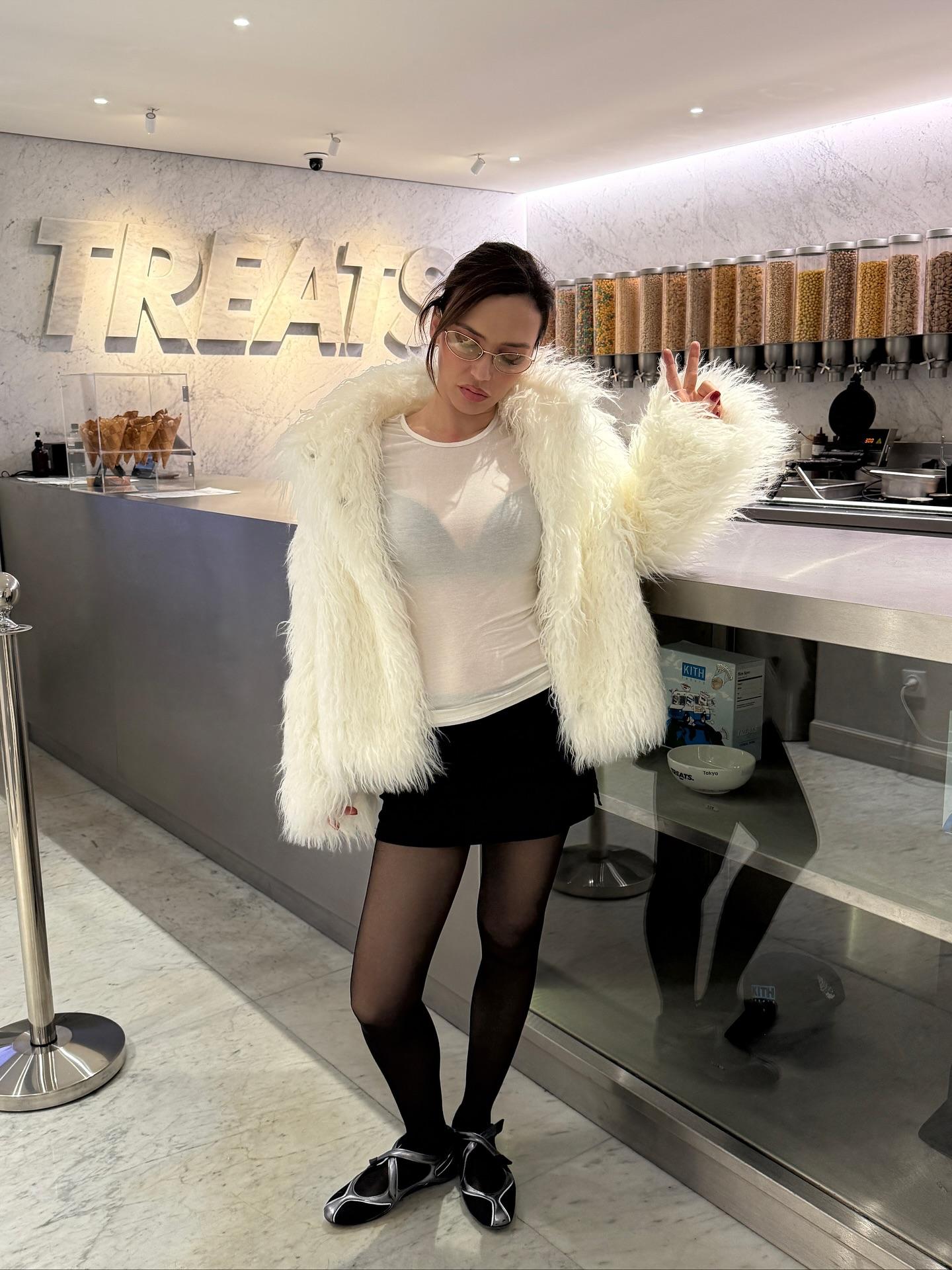 Утеплилась и Наташа Давыдова. Она выбрала короткую и не такую пушистую модель в серо-черных оттенках и стилизовала ее так же на контрастах. Комбо из двух тонких джемперов разных цветов, полюбившееся нам еще год назад, и джинсы она дополнила открытыми босоножками. Очень смело, но повторять не советуем!