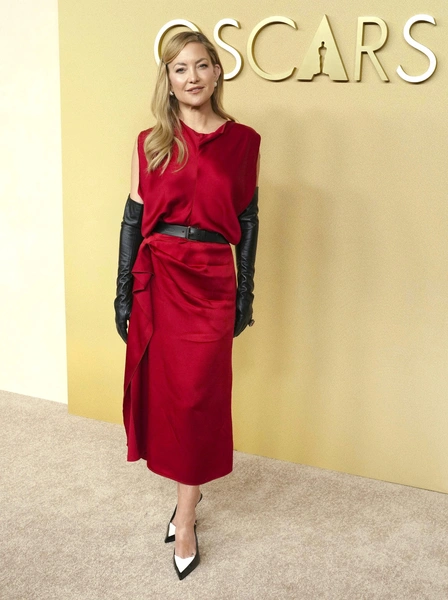 Кейт Хадсон тоже удивила фанатов своим выбором. Актриса появилась в образе Lanvin из коллекции осень-зима 2026 года: ярко-красном платье-футляре из атласа без рукавов, которое дополнили кожаные оперные перчатки, черно-белые слингбэки и тонкий пояс. Но столько внимание привлекло даже не трендовая стилизация или непривычный бьюти-образ в стиле Miu Miu, а ее украшения.