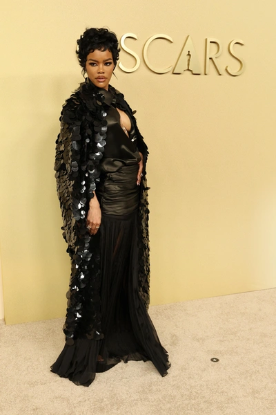Ярче этого кольца на дорожке сияла только дива Тейяна Тейлор. Дресс-код на традиционном ланче номинантов «Оскар» предполагает элегантный, продуманный, но менее строгий стиль, чем на самой церемонии. Что-то вроде cocktail attire или smart casual. И если в основном все сделали ставку на стильные костюмы или элегантные, минималистичные платья, то актриса появилась в черном мини с драпировками, шифоновой прозрачной юбкой и очень смелым декольте, а на плечи накинула длинный кардиган, усыпанный крупными пайетками. Блистать так блистать!