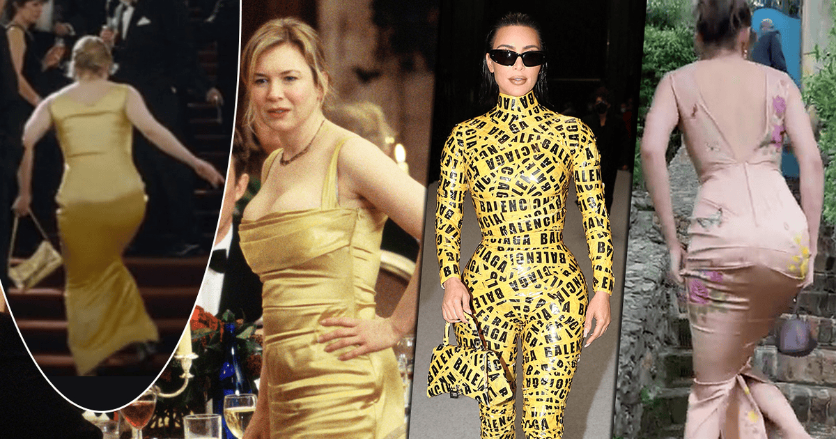 Не знаем, как вам, а нам первым делом на ум пришла Бриджит Джонс — королева неловких ситуаций. В продолжение «Дневника» она сначала не без помощи утягивающего белья еле втиснулась в атласное платье, а потом передвигалась в туго сидящем наряде исключительно семенящими шагами. К слову, самым большим препятствием на пути блондинки тоже были ступеньки