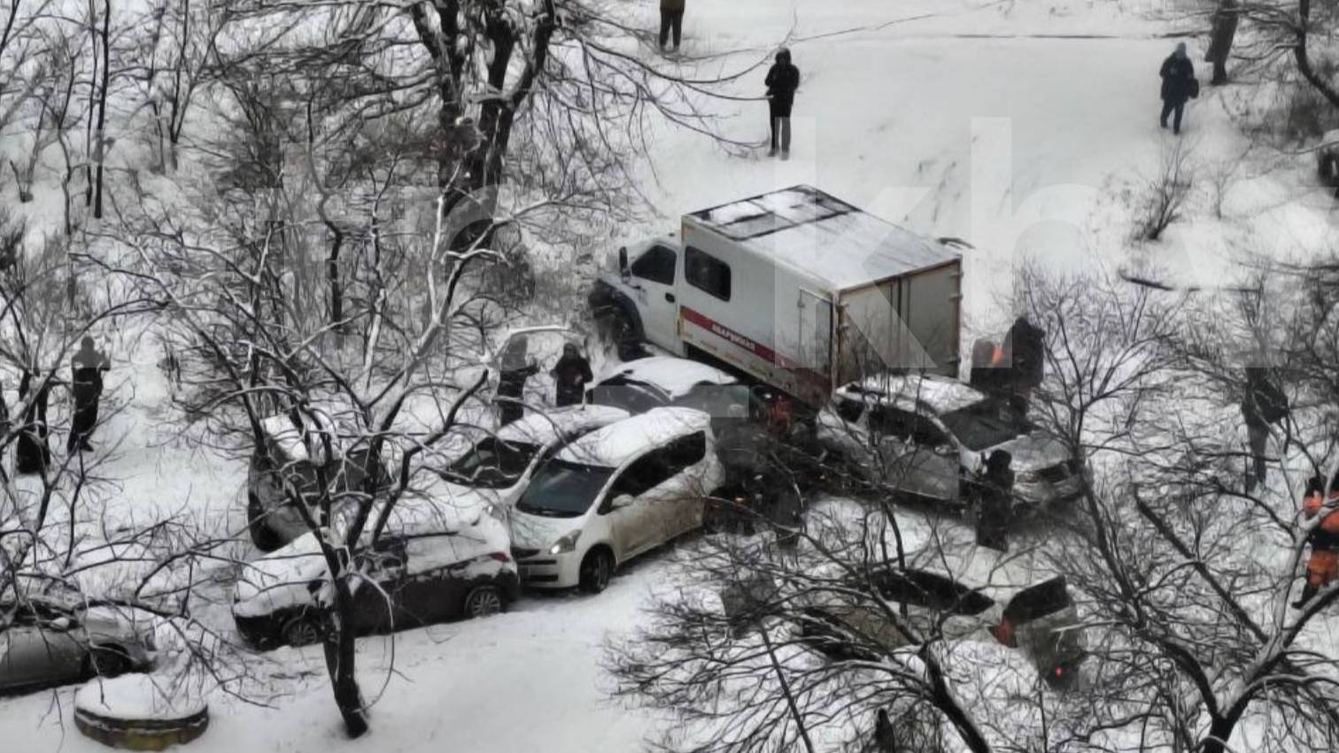 В Хабаровске произошла массовая авария из-за сложных погодных условий и неудачных манёвров. Всё началось во дворе жилого дома на Ростовском переулке, где «Газель» с надписью «аварийная» снесла несколько припаркованных автомобилей.