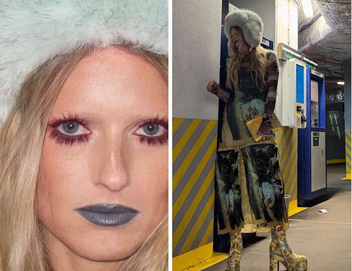Отдельного внимания заслуживает макияж Софьи. Она накрасила губы синей помадой, что несколько «заморозило» образ. А накладные ресницы актрисы сделали ее взгляд более пронзительным.