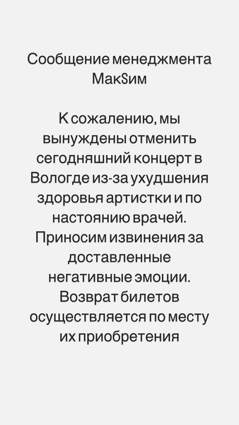 На днях в блоге МакSим появилось сообщение ее менеджмента об отмене концерта в Вологде из-за ухудшения здоровья артистки.